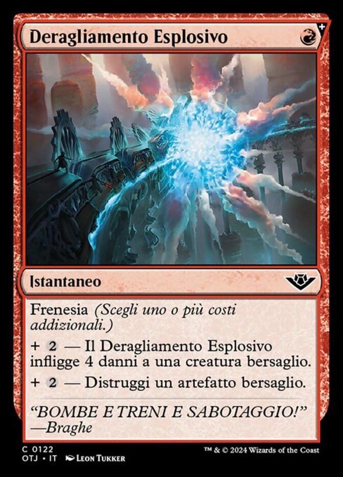 | Rules | Spree (Choose one or more additional costs.) + — Explosive Derailment deals 4 damage to target creature. + — Destroy target artifact. |