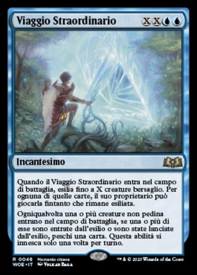 | Rules | When Extraordinary Journey enters the battlefield, exile up to X target creatures. For each of those cards, its owner may play it for as long as it remains exiled. Whenever one or more nontoken creatures enter the battlefield, if one or more of them entered from exile or was cast from exile, you draw a card. This ability triggers only once each turn. |