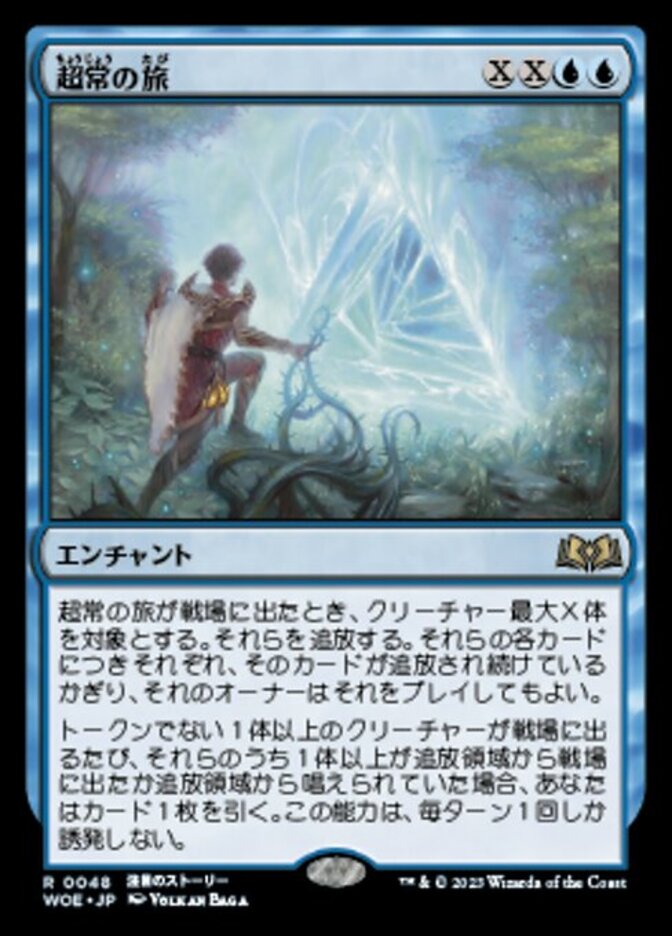 | Rules | When Extraordinary Journey enters the battlefield, exile up to X target creatures. For each of those cards, its owner may play it for as long as it remains exiled. Whenever one or more nontoken creatures enter the battlefield, if one or more of them entered from exile or was cast from exile, you draw a card. This ability triggers only once each turn. |