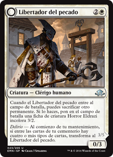 | Rules | When Extricator of Sin enters the battlefield, you may sacrifice another permanent. If you do, create a 3/2 colorless Eldrazi Horror creature token. Delirium — At the beginning of your upkeep, if there are four or more card types among cards in your graveyard, transform Extricator of Sin. // Eldrazi you control have vigilance. , , Sacrifice a non-Eldrazi creature: Create a 3/2 colorless Eldrazi Horror creature token. |