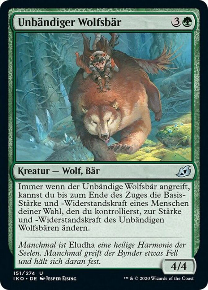 | Rules | Whenever Exuberant Wolfbear attacks, you may change the base power and toughness of target Human you control to Exuberant Wolfbear's power and toughness until end of turn. |