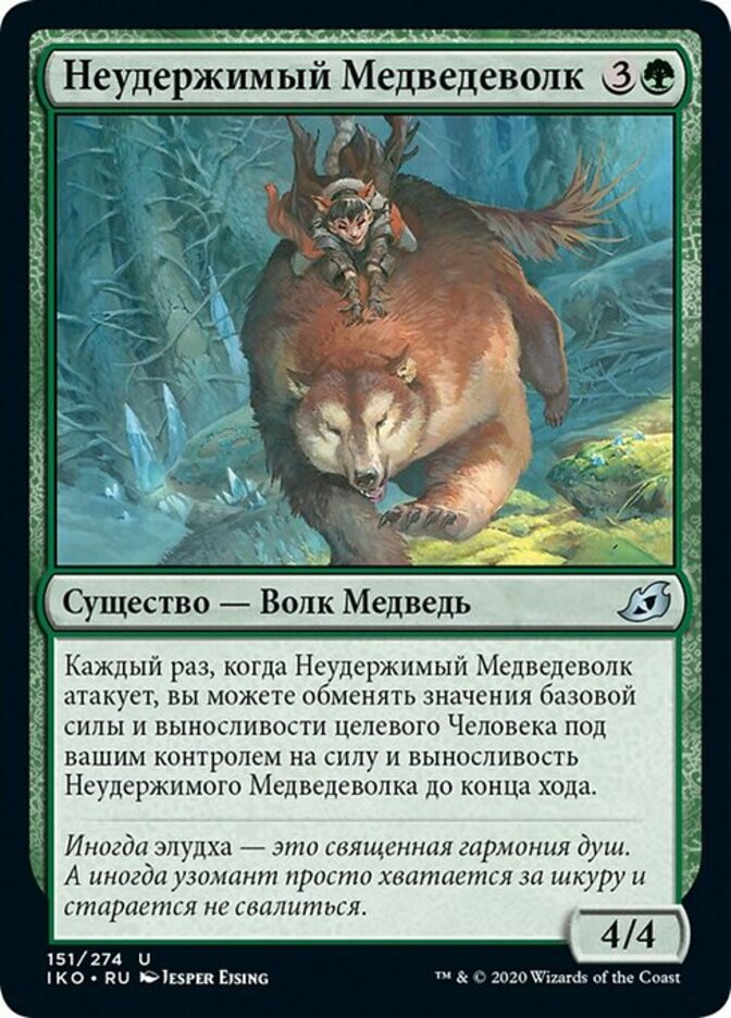 | Rules | Whenever Exuberant Wolfbear attacks, you may change the base power and toughness of target Human you control to Exuberant Wolfbear's power and toughness until end of turn. |