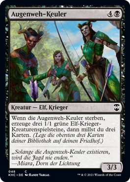 | Rules | When Eyeblight Cullers dies, create three 1/1 green Elf Warrior creature tokens, then mill three cards. (Put the top three cards of your library into your graveyard.) |