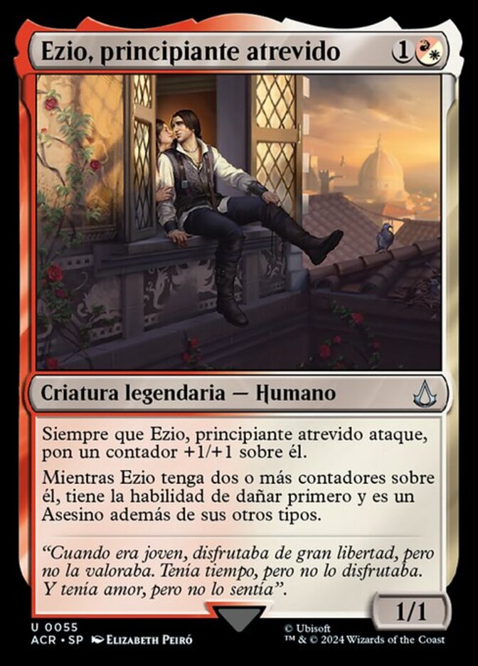 | Rules | Whenever Ezio, Brash Novice attacks, put a +1/+1 counter on it. As long as Ezio has two or more counters on it, it has first strike and is an Assassin in addition to its other types. |