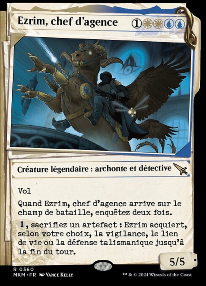 | Rules | Flying When Ezrim, Agency Chief enters the battlefield, investigate twice. (To investigate, create a Clue token. It's an artifact with ", Sacrifice this artifact: Draw a card.") , Sacrifice an artifact: Ezrim gains your choice of vigilance, lifelink, or hexproof until end of turn. |