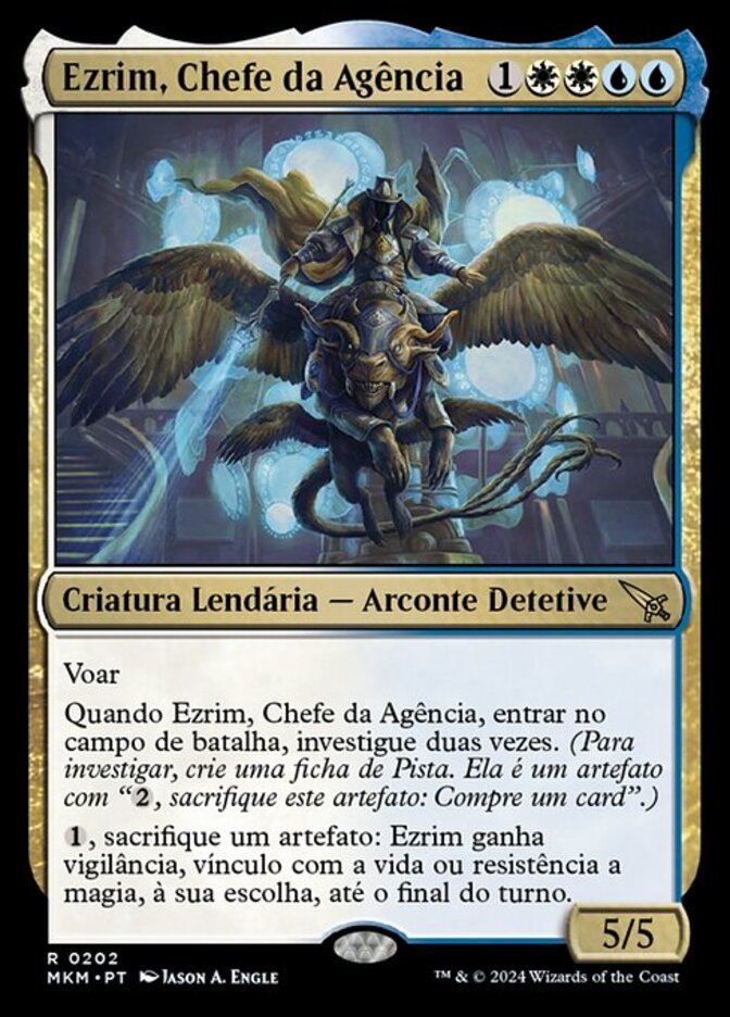 | Rules | Flying When Ezrim, Agency Chief enters the battlefield, investigate twice. (To investigate, create a Clue token. It's an artifact with ", Sacrifice this artifact: Draw a card.") , Sacrifice an artifact: Ezrim gains your choice of vigilance, lifelink, or hexproof until end of turn. |