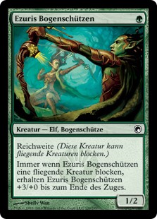| Rules | Reach (This creature can block creatures with flying.) Whenever Ezuri's Archers blocks a creature with flying, Ezuri's Archers gets +3/+0 until end of turn. |