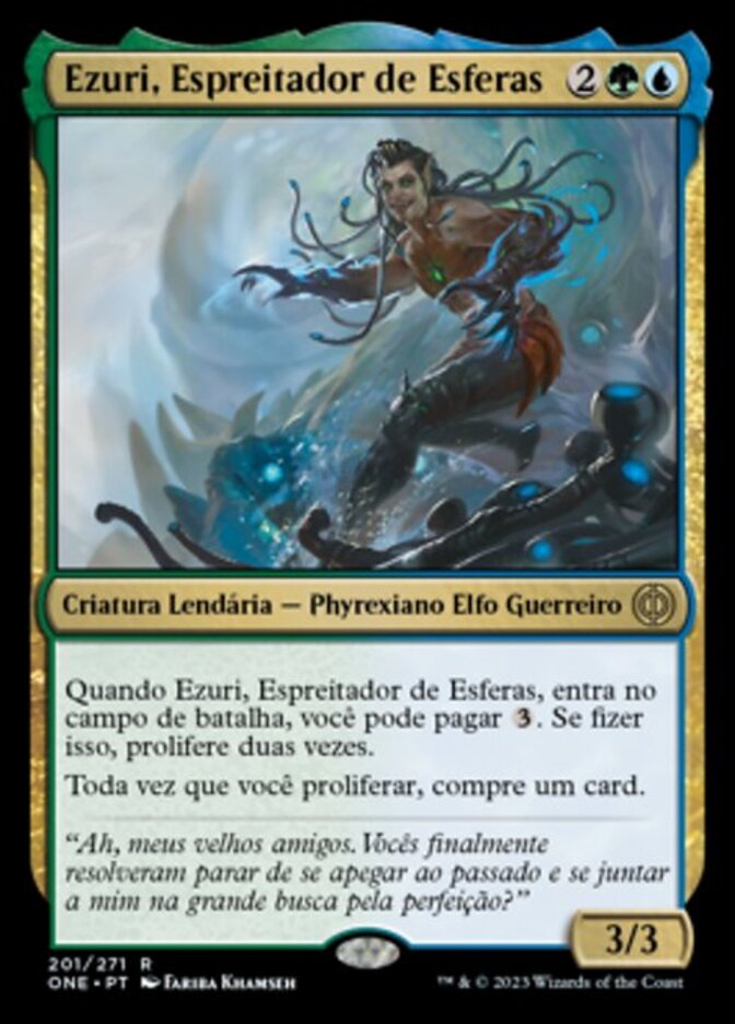 | Rules | When Ezuri, Stalker of Spheres enters the battlefield, you may pay . If you do, proliferate twice. Whenever you proliferate, draw a card. |