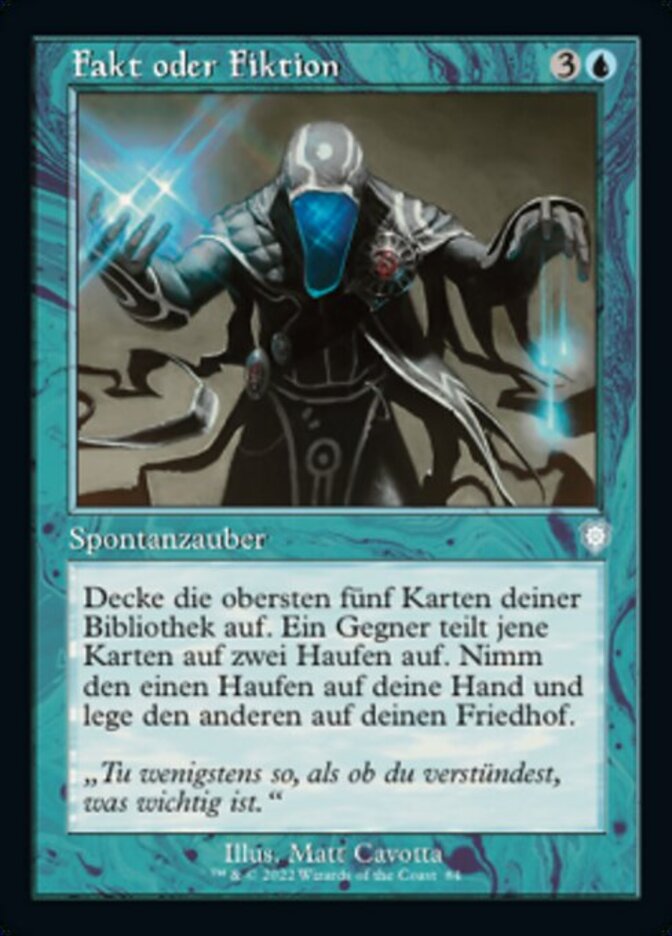 | Rules | Reveal the top five cards of your library. An opponent separates those cards into two piles. Put one pile into your hand and the other into your graveyard. |