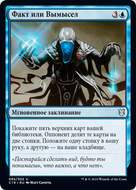 | Rules | Reveal the top five cards of your library. An opponent separates those cards into two piles. Put one pile into your hand and the other into your graveyard. |