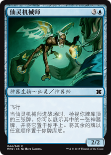 | Rules | Flying When Faerie Mechanist enters the battlefield, look at the top three cards of your library. You may reveal an artifact card from among them and put it into your hand. Put the rest on the bottom of your library in any order. |