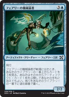 | Rules | Flying When Faerie Mechanist enters the battlefield, look at the top three cards of your library. You may reveal an artifact card from among them and put it into your hand. Put the rest on the bottom of your library in any order. |