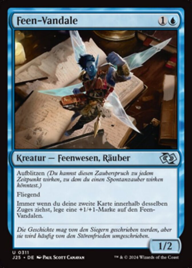 | Rules | Flash Flying Whenever you draw your second card each turn, put a +1/+1 counter on Faerie Vandal. |