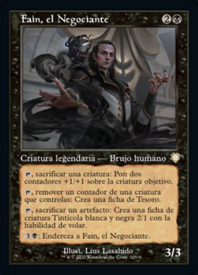 | Rules | , Sacrifice a creature: Put two +1/+1 counters on target creature. , Remove a counter from a creature you control: Create a Treasure token. , Sacrifice an artifact: Create a 2/1 white and black Inkling creature token with flying. : Untap Fain, the Broker. |