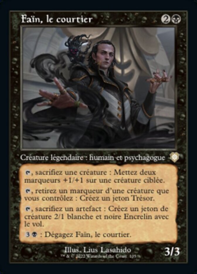 | Rules | , Sacrifice a creature: Put two +1/+1 counters on target creature. , Remove a counter from a creature you control: Create a Treasure token. , Sacrifice an artifact: Create a 2/1 white and black Inkling creature token with flying. : Untap Fain, the Broker. |