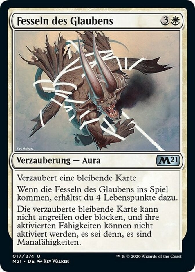 | Rules | Enchant permanent When Faith's Fetters enters the battlefield, you gain 4 life. Enchanted permanent can't attack or block, and its activated abilities can't be activated unless they're mana abilities. |