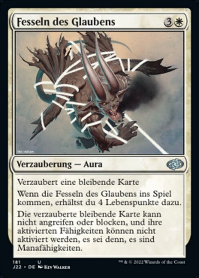 | Rules | Enchant permanent When Faith's Fetters enters the battlefield, you gain 4 life. Enchanted permanent can't attack or block, and its activated abilities can't be activated unless they're mana abilities. |