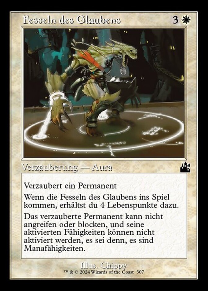 | Rules | Enchant permanent When Faith's Fetters enters the battlefield, you gain 4 life. Enchanted permanent can't attack or block, and its activated abilities can't be activated unless they're mana abilities. |