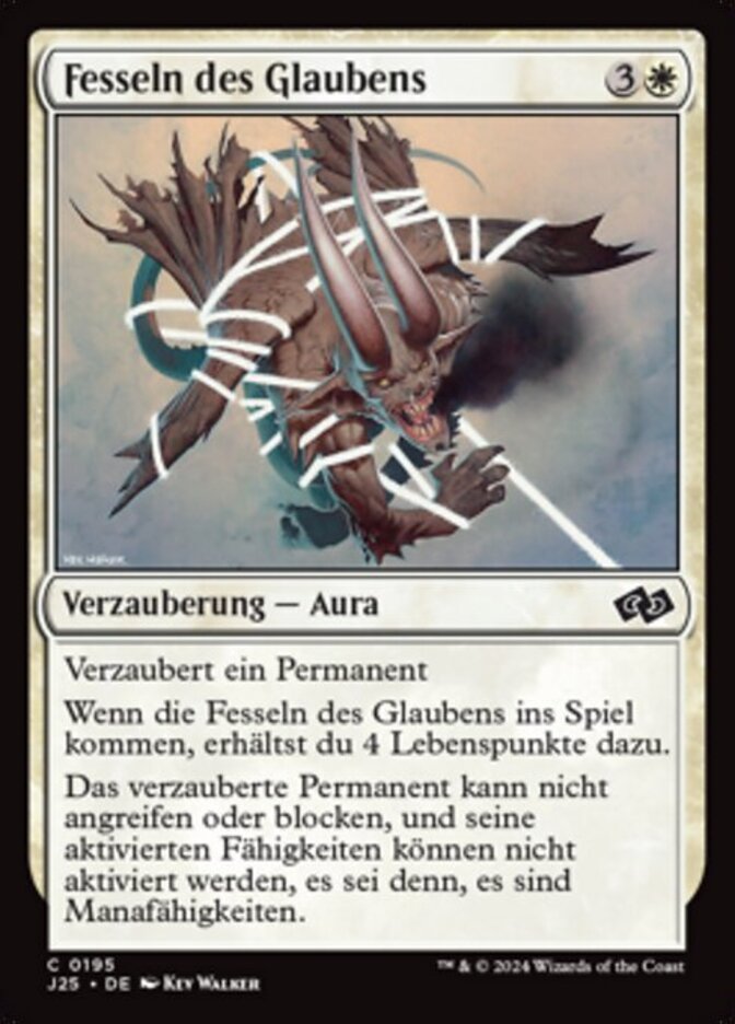 | Rules | Enchant permanent When Faith's Fetters enters the battlefield, you gain 4 life. Enchanted permanent can't attack or block, and its activated abilities can't be activated unless they're mana abilities. |