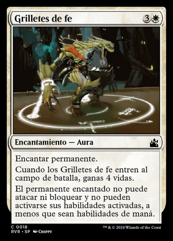 | Rules | Enchant permanent When Faith's Fetters enters the battlefield, you gain 4 life. Enchanted permanent can't attack or block, and its activated abilities can't be activated unless they're mana abilities. |