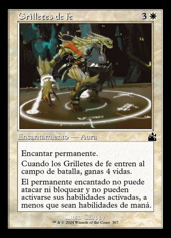 | Rules | Enchant permanent When Faith's Fetters enters the battlefield, you gain 4 life. Enchanted permanent can't attack or block, and its activated abilities can't be activated unless they're mana abilities. |