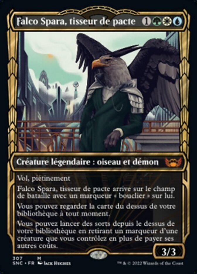 | Rules | Flying, trample Falco Spara, Pactweaver enters the battlefield with a shield counter on it. You may look at the top card of your library any time. You may cast spells from the top of your library by removing a counter from a creature you control in addition to paying their other costs. |