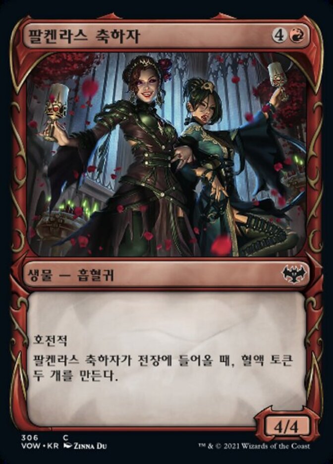 | Rules | Menace (This creature can't be blocked except by two or more creatures.) When Falkenrath Celebrants enters the battlefield, create two Blood tokens. (They're artifacts with ", , Discard a card, Sacrifice this artifact: Draw a card.") |