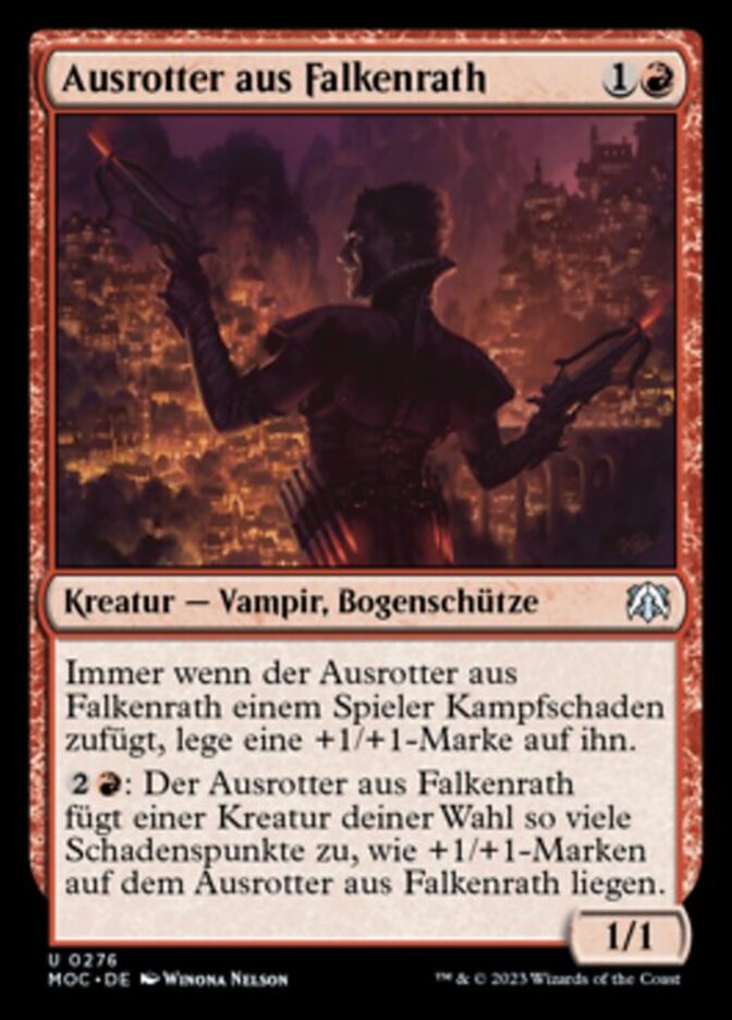 | Rules | Whenever Falkenrath Exterminator deals combat damage to a player, put a +1/+1 counter on it. : Falkenrath Exterminator deals damage to target creature equal to the number of +1/+1 counters on Falkenrath Exterminator. |
