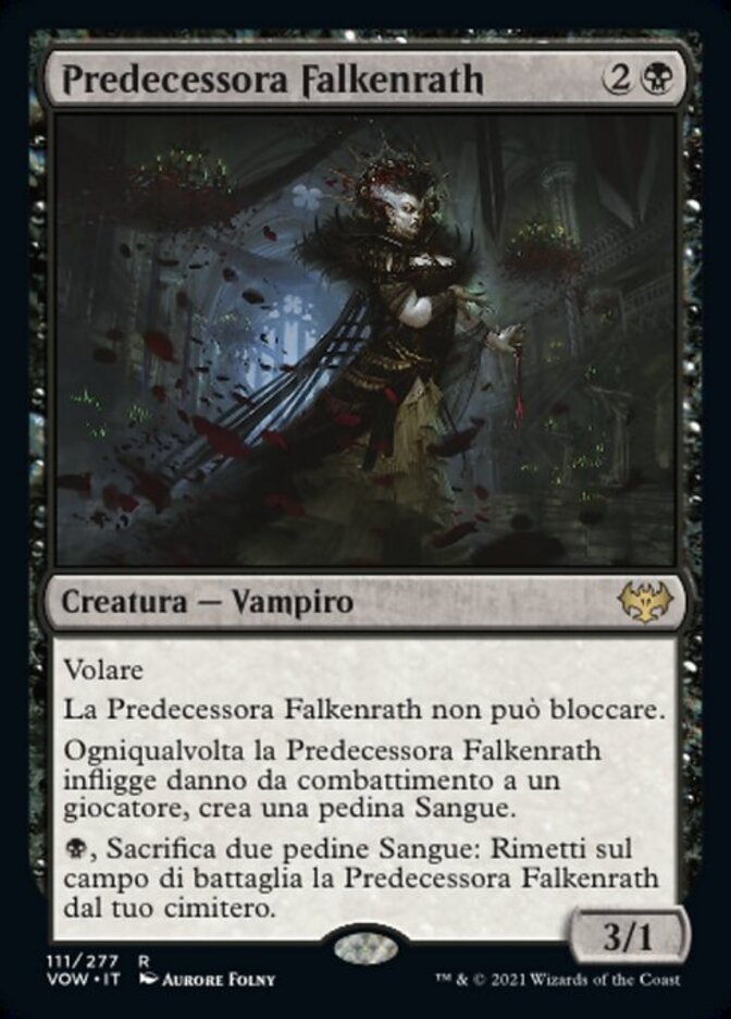 | Rules | Flying Falkenrath Forebear can't block. Whenever Falkenrath Forebear deals combat damage to a player, create a Blood token. , Sacrifice two Blood tokens: Return Falkenrath Forebear from your graveyard to the battlefield. |