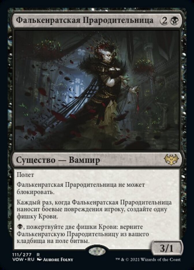 | Rules | Flying Falkenrath Forebear can't block. Whenever Falkenrath Forebear deals combat damage to a player, create a Blood token. , Sacrifice two Blood tokens: Return Falkenrath Forebear from your graveyard to the battlefield. |