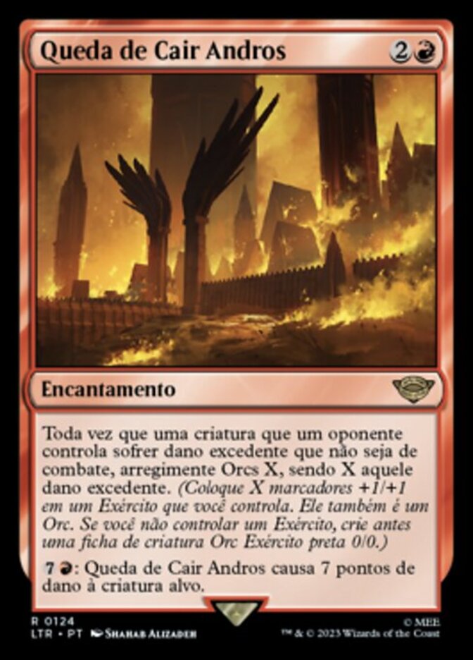 | Rules | Whenever a creature an opponent controls is dealt excess noncombat damage, amass Orcs X, where X is that excess damage. (Put X +1/+1 counters on an Army you control. It's also an Orc. If you don't control an Army, create a 0/0 black Orc Army creature token first.) : Fall of Cair Andros deals 7 damage to target creature. |