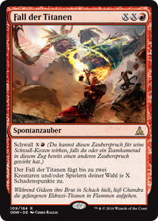 | Rules | Surge (You may cast this spell for its surge cost if you or a teammate has cast another spell this turn.) Fall of the Titans deals X damage to each of up to two targets. |