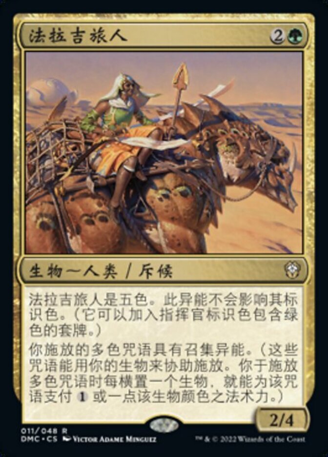 | Rules | Fallaji Wayfarer is all colors. This ability doesn't affect its color identity. (It can be in any deck whose commander's color identity includes green.) Multicolored spells you cast have convoke. (Your creatures can help cast those spells. Each creature you tap while casting a multicolored spell pays for or one mana of a color that creature is.) |