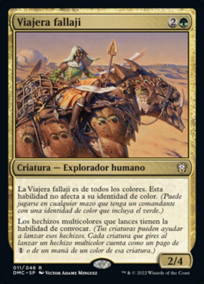 | Rules | Fallaji Wayfarer is all colors. This ability doesn't affect its color identity. (It can be in any deck whose commander's color identity includes green.) Multicolored spells you cast have convoke. (Your creatures can help cast those spells. Each creature you tap while casting a multicolored spell pays for or one mana of a color that creature is.) |