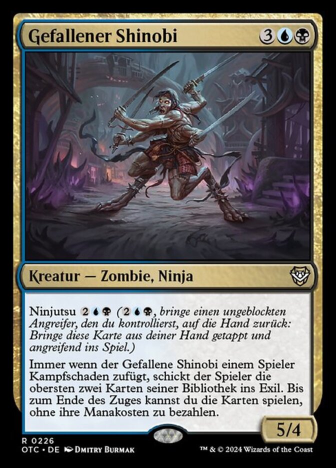 | Rules | Ninjutsu (, Return an unblocked attacker you control to hand: Put this card onto the battlefield from your hand tapped and attacking.) Whenever Fallen Shinobi deals combat damage to a player, that player exiles the top two cards of their library. Until end of turn, you may play those cards without paying their mana costs. |