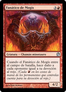 | Rules | When Fanatic of Mogis enters the battlefield, it deals damage to each opponent equal to your devotion to red. (Each in the mana costs of permanents you control counts toward your devotion to red.) |