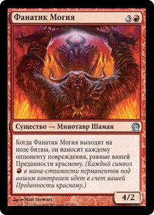 | Rules | When Fanatic of Mogis enters the battlefield, it deals damage to each opponent equal to your devotion to red. (Each in the mana costs of permanents you control counts toward your devotion to red.) |