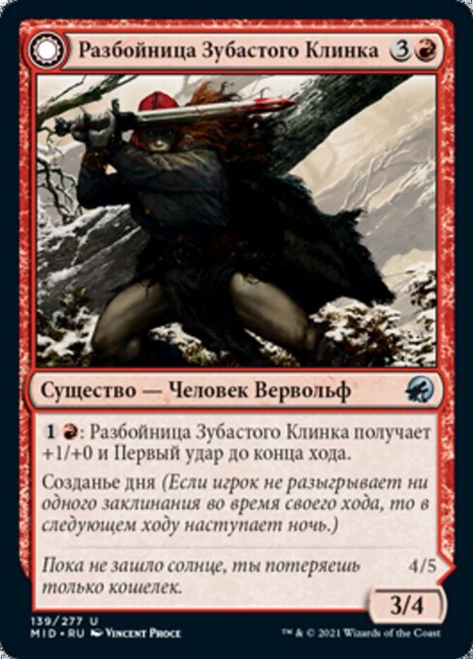 | Rules | : Fangblade Brigand gets +1/+0 and gains first strike until end of turn. Daybound (If a player casts no spells during their own turn, it becomes night next turn.) // : Fangblade Eviscerator gets +1/+0 and gains first strike until end of turn. : Creatures you control get +2/+0 until end of turn. Nightbound (If a player casts at least two spells during their own turn, it becomes day next turn.) |