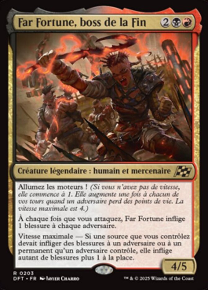 | Rules | Start your engines! (If you have no speed, it starts at 1. It increases once on each of your turns when an opponent loses life. Max speed is 4.) Whenever you attack, Far Fortune deals 1 damage to each opponent. Max speed — If a source you control would deal damage to an opponent or a permanent an opponent controls, it deals that much damage plus 1 instead. |