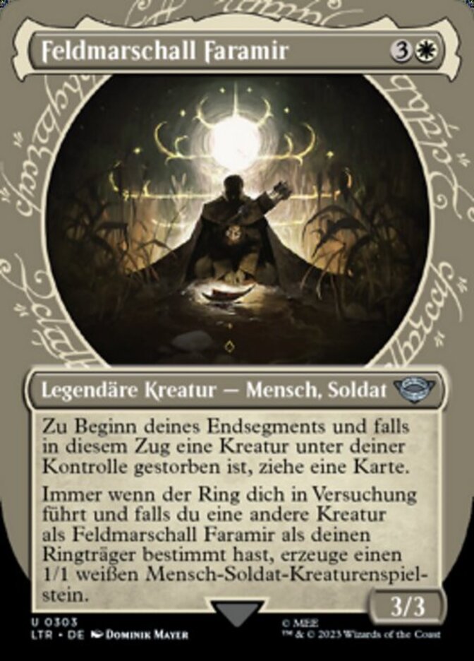 | Rules | At the beginning of your end step, if a creature died under your control this turn, draw a card. Whenever the Ring tempts you, if you chose a creature other than Faramir, Field Commander as your Ring-bearer, create a 1/1 white Human Soldier creature token. |