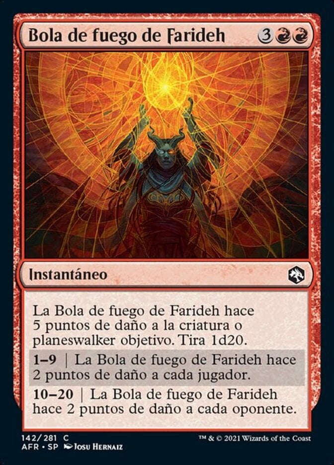 | Rules | Farideh's Fireball deals 5 damage to target creature or planeswalker. Roll a d20. 1—9 | Farideh's Fireball deals 2 damage to each player. 10—20 | Farideh's Fireball deals 2 damage to each opponent. |