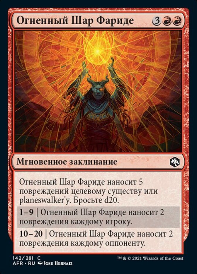 | Rules | Farideh's Fireball deals 5 damage to target creature or planeswalker. Roll a d20. 1—9 | Farideh's Fireball deals 2 damage to each player. 10—20 | Farideh's Fireball deals 2 damage to each opponent. |
