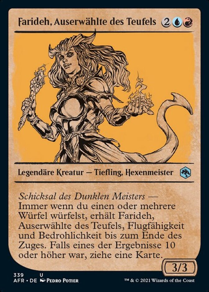 | Rules | Dark One's Own Luck — Whenever you roll one or more dice, Farideh, Devil's Chosen gains flying and menace until end of turn. If any of those results was 10 or higher, draw a card. |