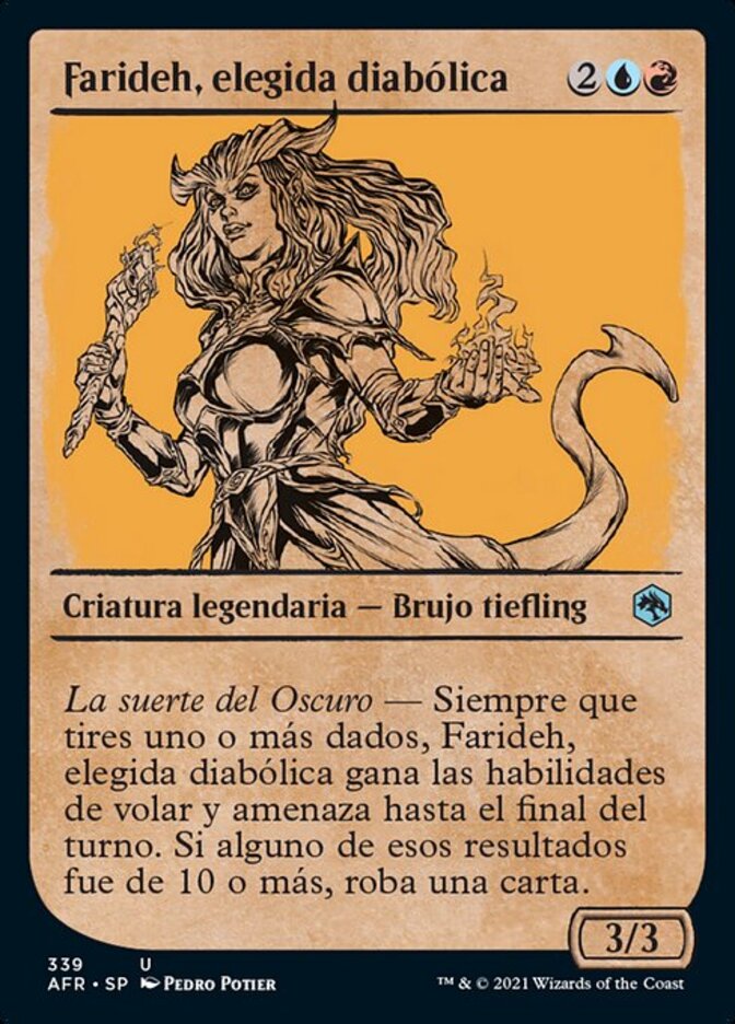 | Rules | Dark One's Own Luck — Whenever you roll one or more dice, Farideh, Devil's Chosen gains flying and menace until end of turn. If any of those results was 10 or higher, draw a card. |