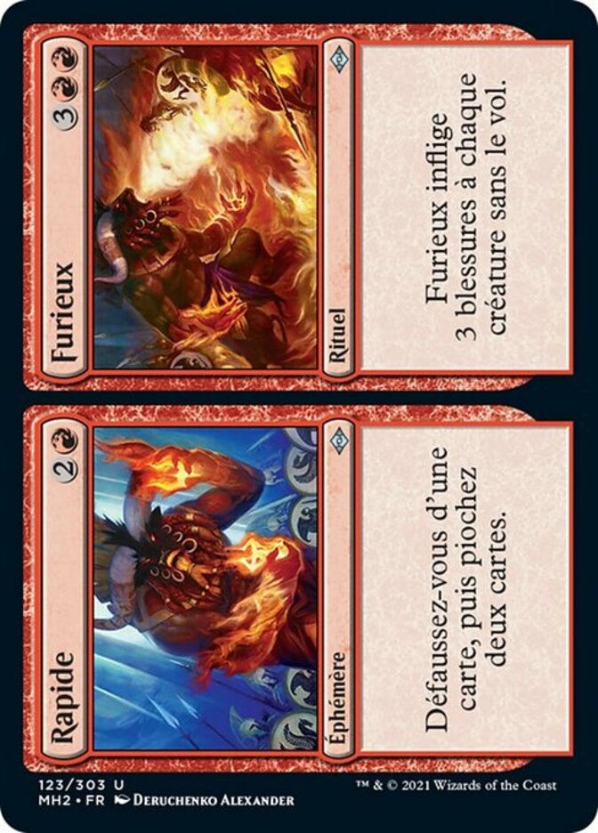 | Rules | Discard a card, then draw two cards. // Furious deals 3 damage to each creature without flying. |