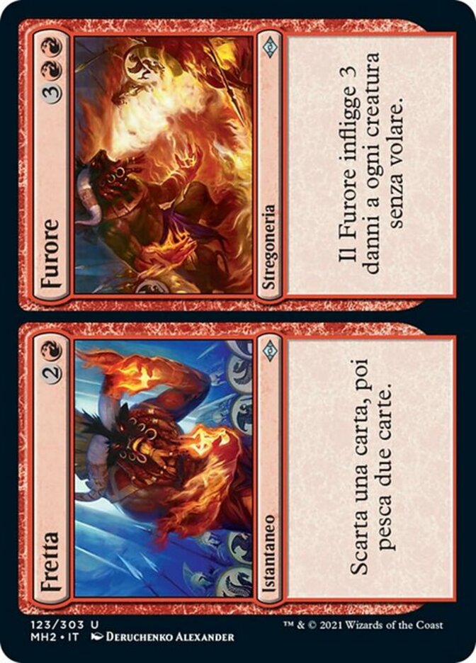 | Rules | Discard a card, then draw two cards. // Furious deals 3 damage to each creature without flying. |