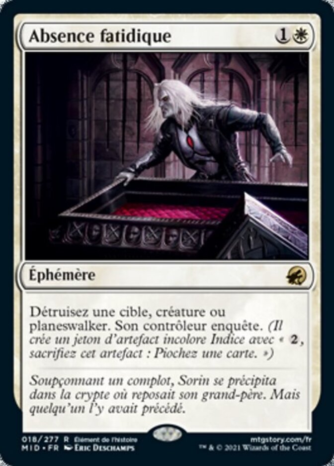 | Rules | Destroy target creature or planeswalker. Its controller investigates. (They create a colorless Clue artifact token with ", Sacrifice this artifact: Draw a card.") |