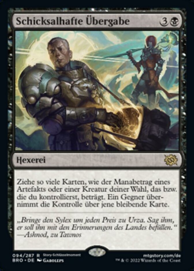 | Rules | Draw cards equal to the mana value of target artifact or creature you control. An opponent gains control of that permanent. |