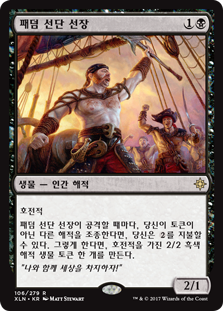 | Rules | Menace Whenever Fathom Fleet Captain attacks, if you control another nontoken Pirate, you may pay . If you do, create a 2/2 black Pirate creature token with menace. |