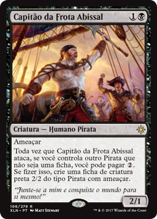 | Rules | Menace Whenever Fathom Fleet Captain attacks, if you control another nontoken Pirate, you may pay . If you do, create a 2/2 black Pirate creature token with menace. |